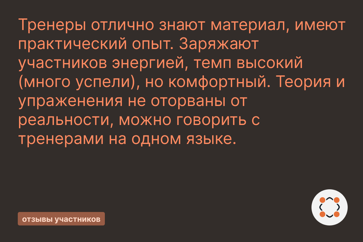 - Подтвержденная квалификация тренеров: дипломы о профессиональной переподготовке от Учебного центра подготовки руководителей НИУ ВШЭ.