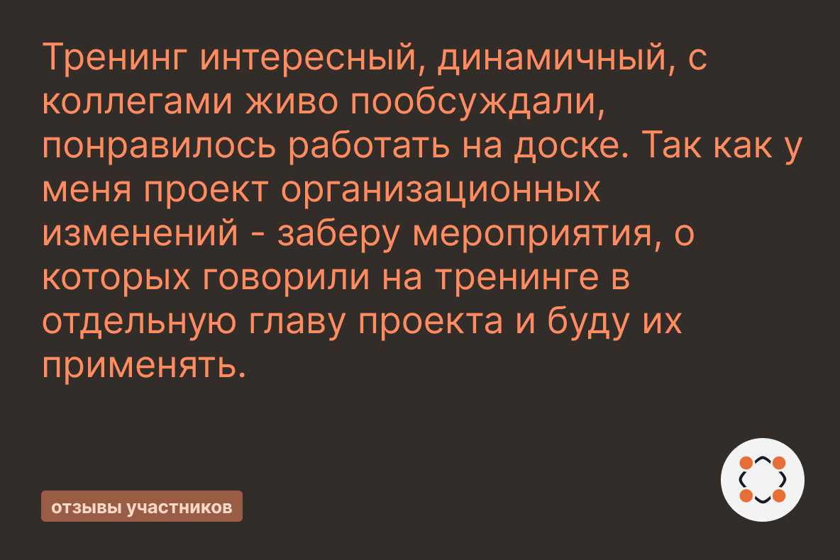 Как итог, в отзывах по результатам тренингов участники отмечают, что контент тренингов хорошо адаптирован для их компании.