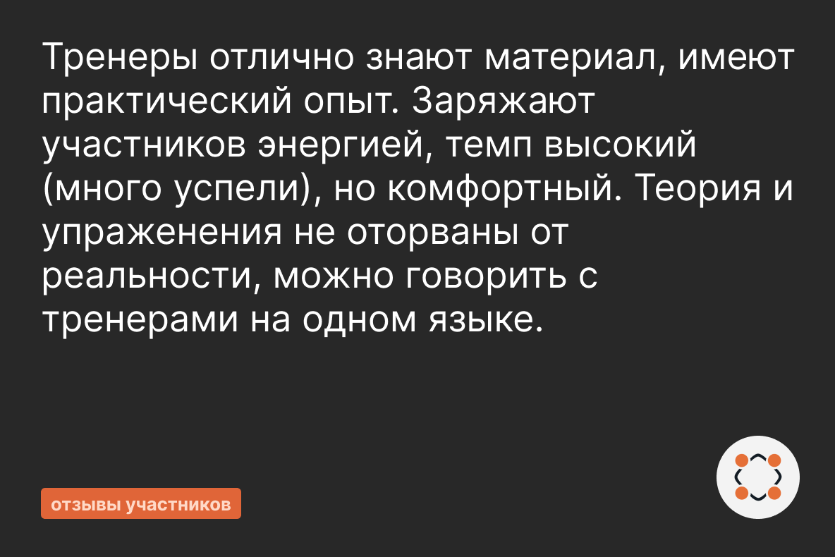 - Подтвержденная квалификация тренеров: дипломы о профессиональной переподготовке от Учебного центра подготовки руководителей НИУ ВШЭ.